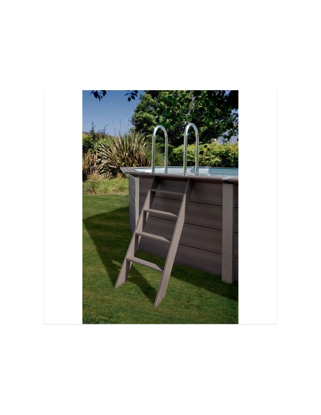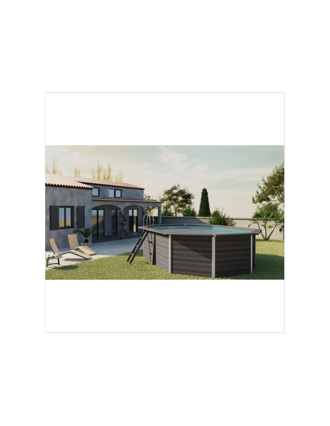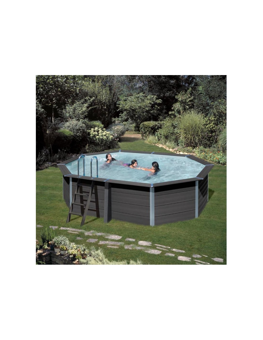 Piscina de aspecto moderno y vanguardista hecha de una aleación de madera y de P.V.C. Una alternativa a las piscinas de madera que presenta muchas ventajas: montaje sencillo, material muy resistente y aislante que permite mantener la temperatura del agua, gran durabilidad. En el kit se incluye todos los componentes para el montaje: paneles, filtración de arena, liner y escaleras.