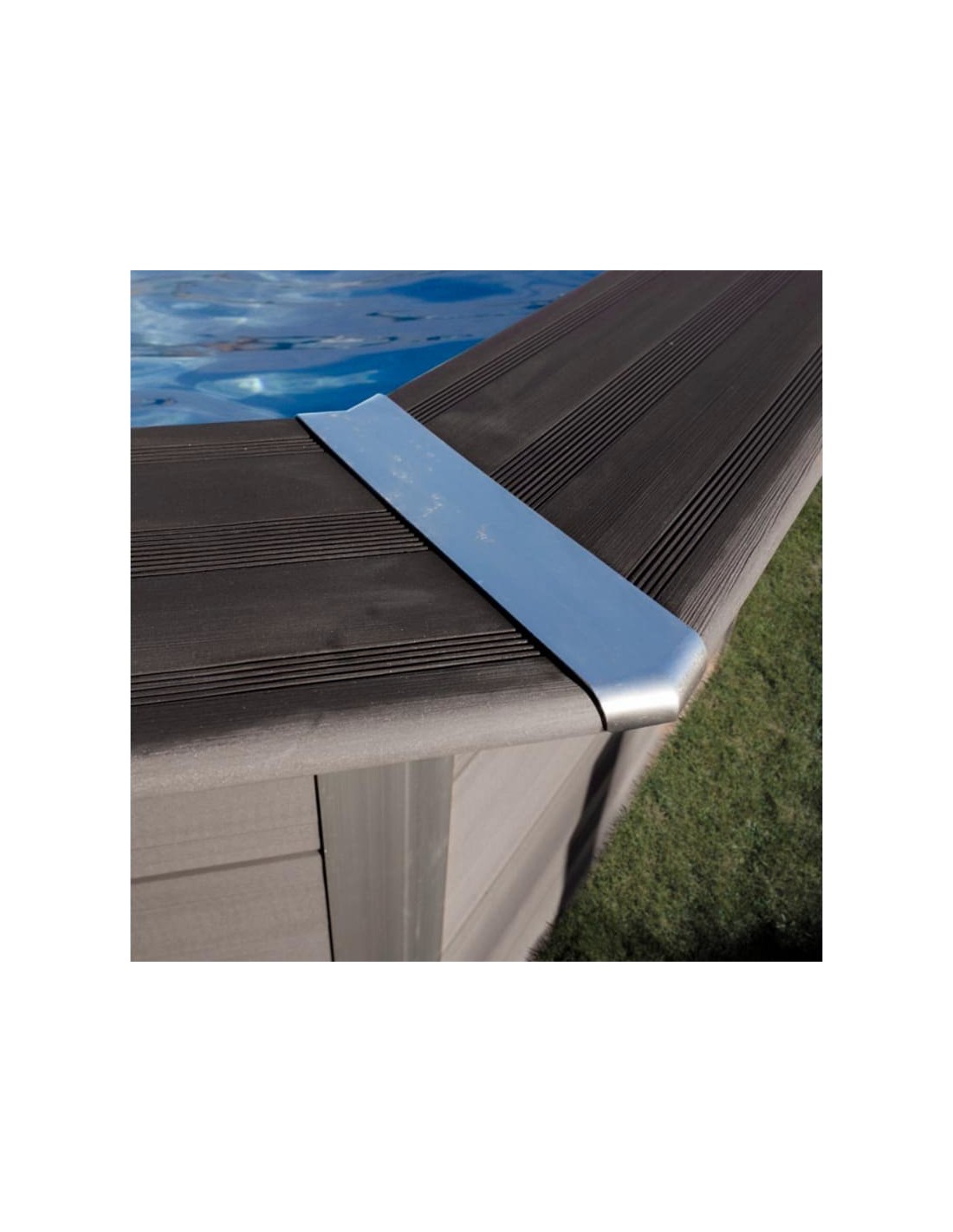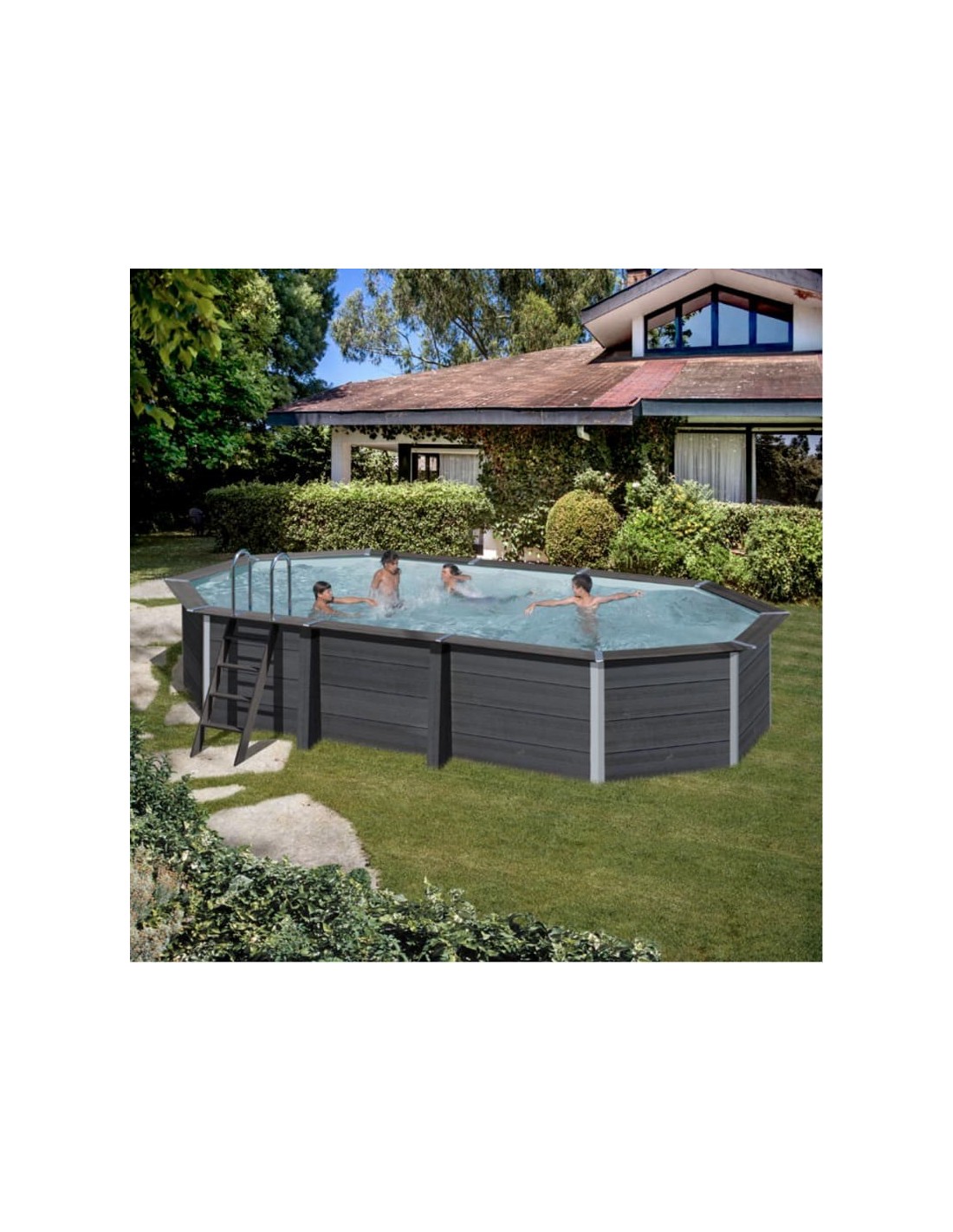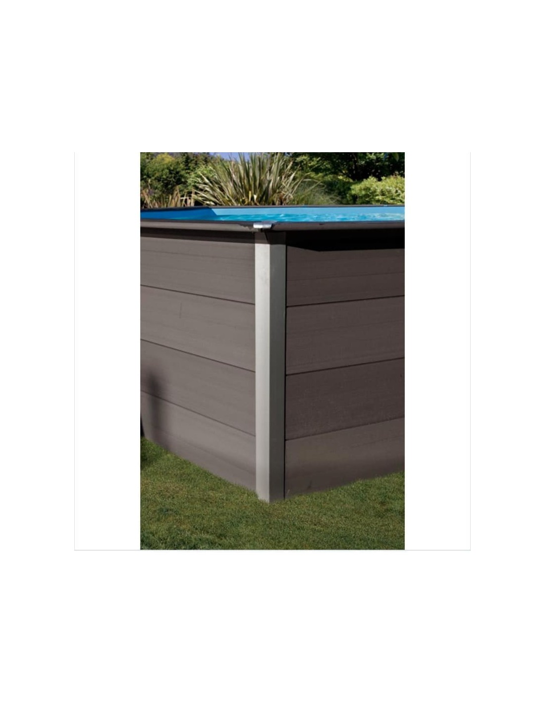 Piscina de aspecto moderno y vanguardista hecha de una aleación de madera y de P.V.C. Una alternativa a las piscinas de madera que presenta muchas ventajas: montaje sencillo, material muy resistente y aislante que permite mantener la temperatura del agua, gran durabilidad. En el kit se incluye todos los componentes para el montaje: paneles, filtración de arena, liner y escaleras.