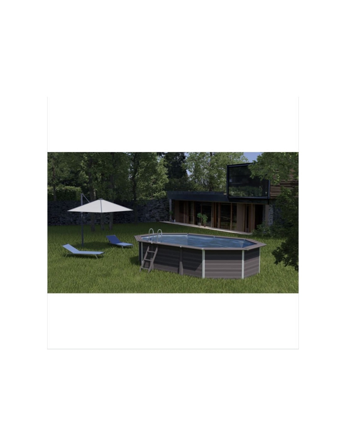 Piscina de aspecto moderno y vanguardista hecha de una aleación de madera y de P.V.C. Una alternativa a las piscinas de madera que presenta muchas ventajas: montaje sencillo, material muy resistente y aislante que permite mantener la temperatura del agua, gran durabilidad. En el kit se incluye todos los componentes para el montaje: paneles, filtración de arena, liner y escaleras.