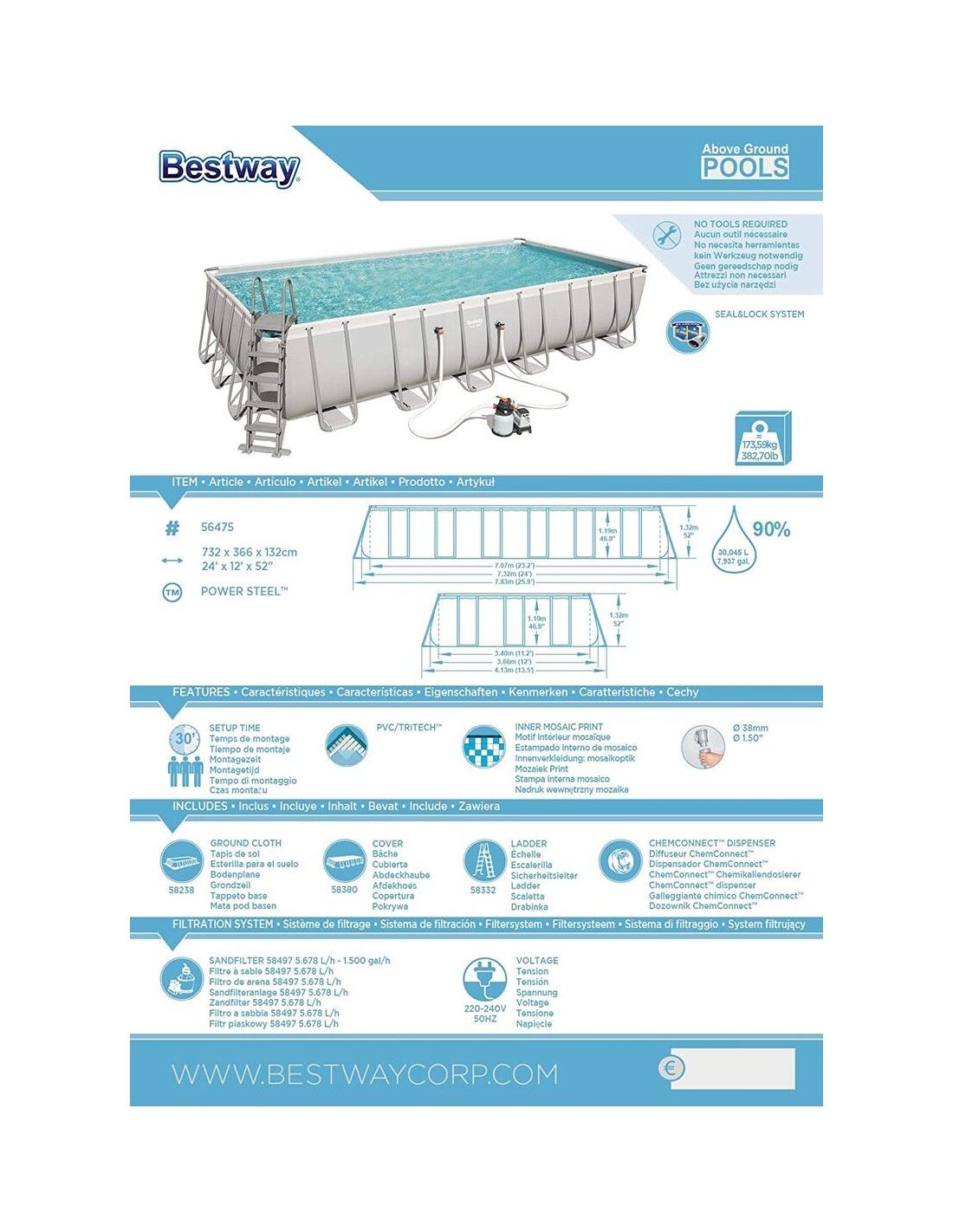 Piscina elevada tubular rectangular 732x366x132cms. Bestway 56475
